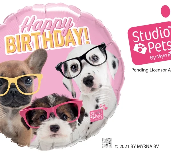 18″ RND 01Un. BDAY PUPPIES WITH EYEGLASSES