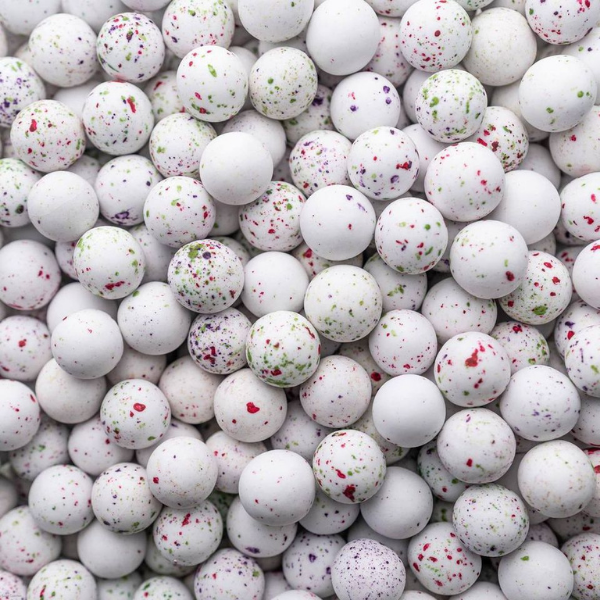 Mistura de pérolas de chocolate e esferas crocantes em várias cores.