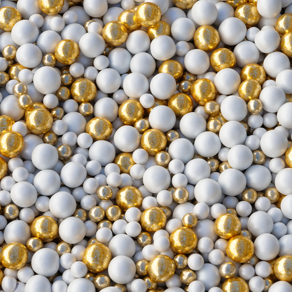 Mistura de esferas crocantes e pérolas de chocolate nas cores branco e ouro vintage.