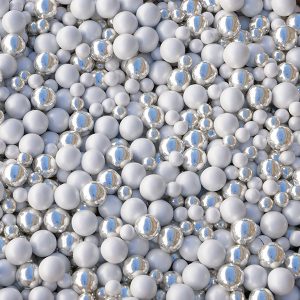 Mistura de esferas crocantes e pérolas de chocolate nas cores branco e prata.