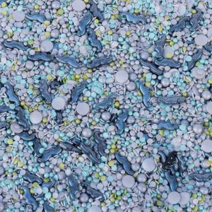 Mistura de esferas crocantes e pérolas de chocolate nas cores branco e prata.