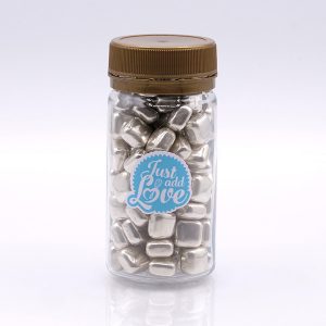 Mistura de esferas crocantes e pérolas de chocolate nas cores branco e prata.